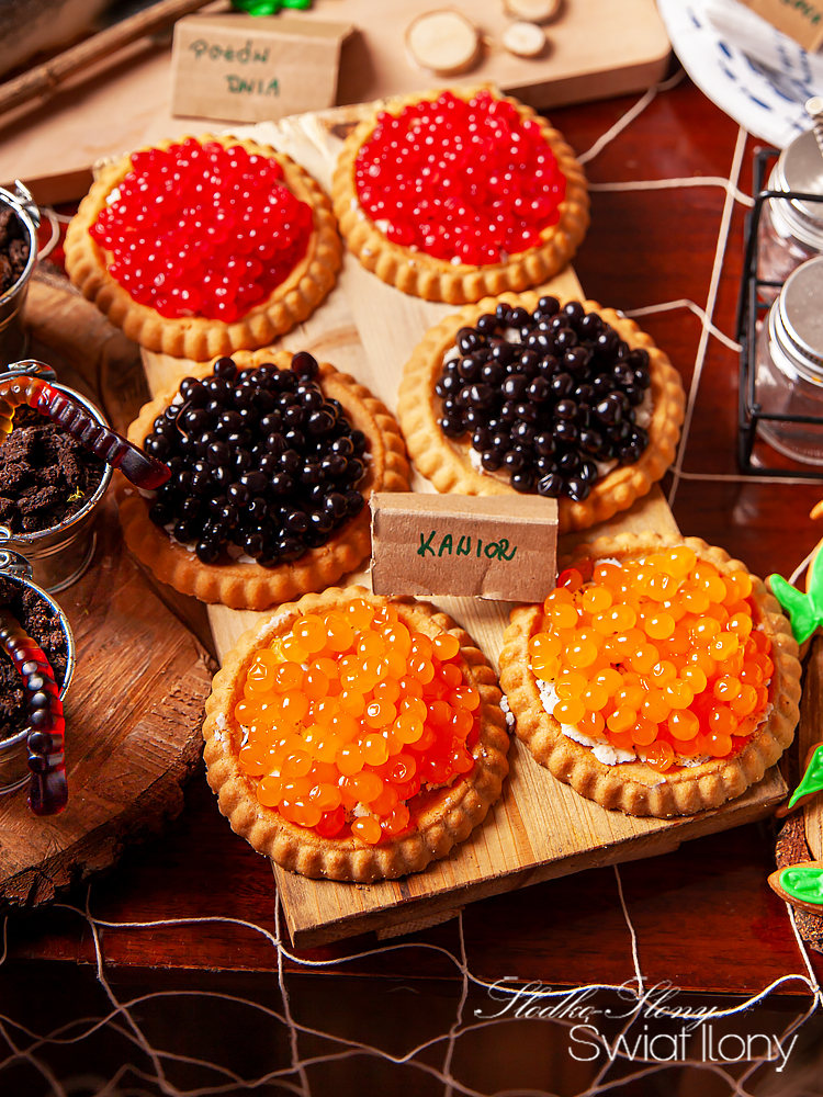Słodkości zaserwowałam na drewnianych pniach, deskach, skrzynkach i "mini paletach", a także w metalowych wiaderkach, stół zaś udekorowałam siatką (tak, wiem, to siatka rybacka, nie wędkarska, ale idealnie mi pasowała do całości 😁). Do dekoracji użyłam również tekturowej girlandy "Happy Birthday" oraz prawdziwych przynęt spinningowych, które ukradłam Adasiowi z torby wędkarskiej 😂🙈 Fajną ozdobę stanowił tez tatarak, który zamówiłam w jednej z internetowych kwiaciarni. Dodatkową atrakcją były: duża, ręcznie robiona drewniana ryba, słoiki z kamieniami i mchem, napełnione wodą i przewiązane sznurkiem jutowym, a także drewniane mini krzesełko dla wędkarza i papierowe talerzyki oraz kubeczki z motywem rybek.